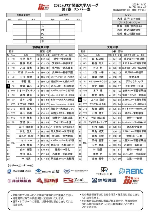広瀬監督 スクラムを重視しました。猿渡は1番(プロップ)もできるので期待しています。セットプレーで優位に立たないと天理相手には厳しいと考えて猿渡(をフッカー)にしました。私たちは常に関西で優勝を目指しているので、タイトルを取りにいきたい。セットプレーで勝負をかけたいということです。
